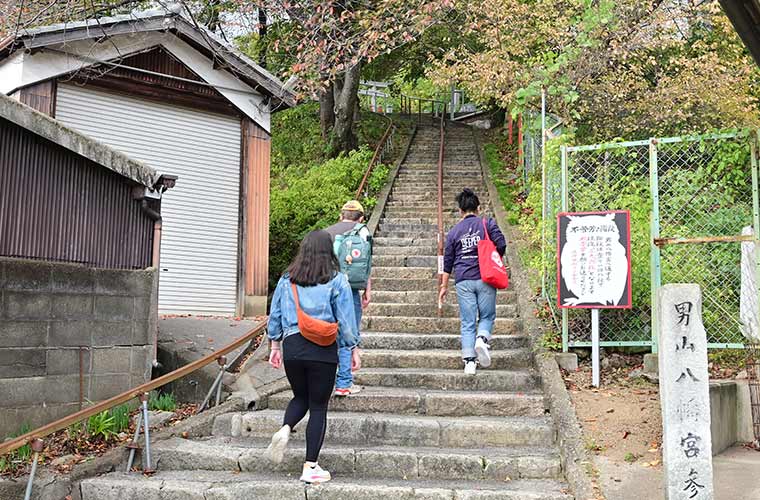 After a 10-minute bicycle ride from Himeji Castle, we arrived at Otokoyama Hachimangu Shrine, a beloved local shrine. Climbing the steps to the grounds brings you to a small hill with views of both Himeji Castle and the city.